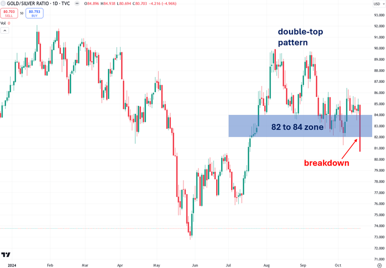 Another key confirmation I've been watching for is a breakdown in the gold-to-silver ratio, a useful indicator for assessing silver's price trajectory. As I stated, a close below the 83 to 84 support zone is valuable for confirming the start of a silver rally and its outperformance over gold—and that’s exactly what happened on Friday: