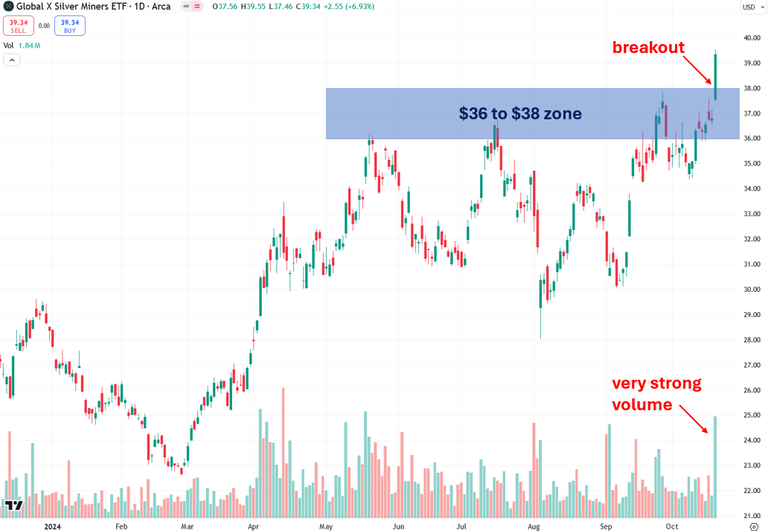 Silver mining stocks are also important to watch for confirming silver's price movements, as they often mirror investor sentiment toward the metal. The Global X Silver Miners ETF (symbol: SIL), the most heavily traded silver mining stock ETF, had been stuck in a flat range since April. I've been stating that a strong, high-volume close above the $36 to $38 resistance zone would indicate that both silver and silver mining stocks are primed for a major breakout—and that's exactly what occurred on Friday. I believe that those who were lamenting the poor performance of silver mining stocks will soon be singing a different tune!