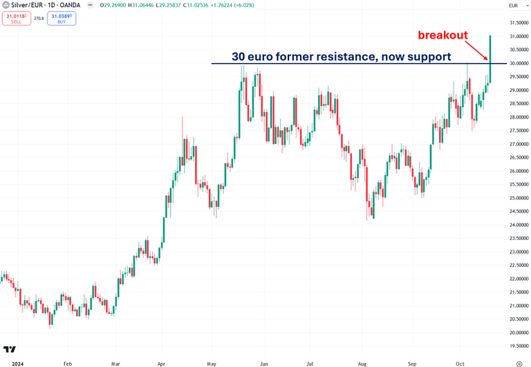 The next condition I outlined was that silver priced in euros must decisively close above the €30 resistance level, which was established at the May peak. I stated that this event would help confirm a close above $32.50, greatly reducing the chances of it being a false breakout. I find it valuable to analyze silver priced in euros, as this approach removes the impact of U.S. dollar fluctuations, offering a clearer view of silver's intrinsic strength or weakness. Notably, silver priced in euros often respects round numbers like €26, €27, and €28, frequently establishing key support and resistance levels at these points. On Friday, silver finally broke through the €30 level with such momentum that it even closed above €31, signaling the strong potential for further gains in the coming week.