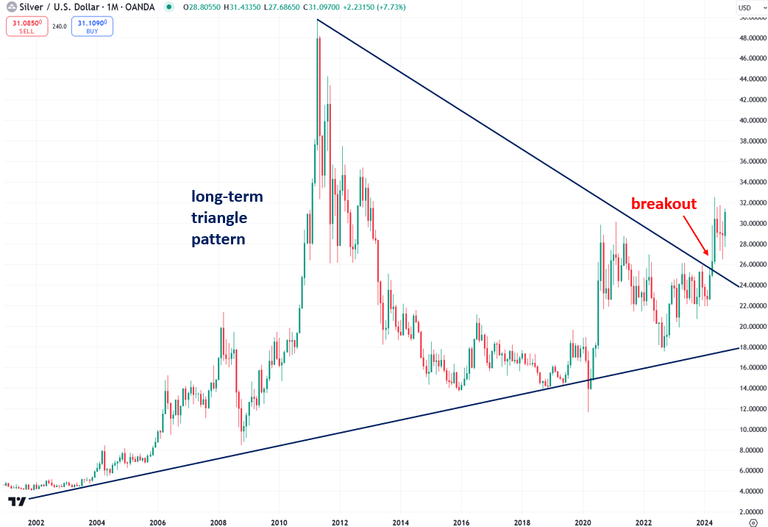 There is a high probability that silver will quickly run to $50 in the course of this rally. I'm focusing on $50 as a relatively short-term target because it’s a significant psychological level and the peak reached during both the 1980 and 2011 rallies. One of the reasons why I’m so bullish on silver is because its monthly chart reveals a recent breakout from a massive, two-decade-long triangle pattern. This breakout confirms that silver is on the verge of a powerful bull market: