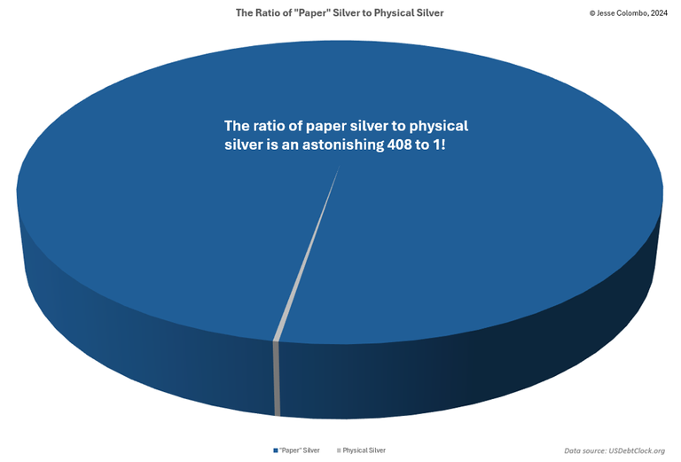 The risk of an explosive silver short squeeze is further amplified by the astonishing ratio of 408 ounces of "paper" silver—ETFs, futures, and other derivatives—for every single ounce of physical silver. In a violent short squeeze, holders of "paper" silver could be forced to scramble for the extremely scarce physical silver to fulfill their contractual obligations. This would cause the price of "paper" silver products to collapse, while physical silver prices would skyrocket to jaw-dropping levels, potentially reaching several hundred dollars per ounce (this event is what may fulfill the price target implied by the cup and handle pattern I showed earlier).