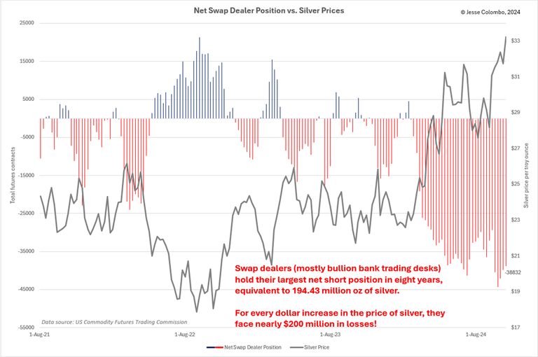 Many analysts believe that bullion banks like JPMorgan and UBS are engaging in aggressive naked short-selling—dumping silver futures without actually holding the physical silver to back them up—in an effort to manipulate silver prices downward. There is a strong chance that these banks will end up on the wrong side of the trade as this rally continues, triggering a powerful silver short squeeze. Given the current size of their short position, bullion banks face nearly $200 million in losses for every dollar increase in the price of silver. This means they lost nearly $400 million on Friday alone! Now, just imagine what will happen as silver climbs by $5, $10, $20, and beyond from this point.