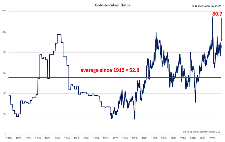 The long-term gold-to-silver ratio chart reveals that silver is currently significantly undervalued compared to gold, indicating that silver has much more room to rise in order to catch up. If the ratio were to revert to its historical average of 52.8 since 1915, even without any increase in gold’s price, silver would be valued at a respectable $51.55 per ounce.