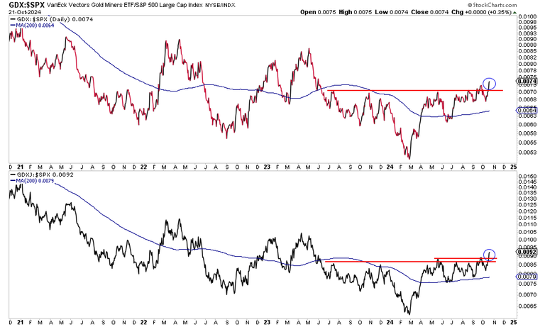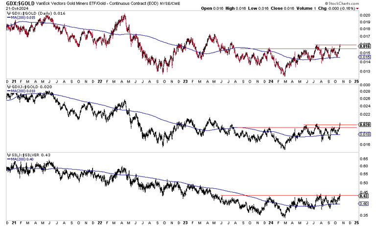 The gold stocks are very close to breaking out against Gold and the same can be said about the silver stocks breaking out against Silver.