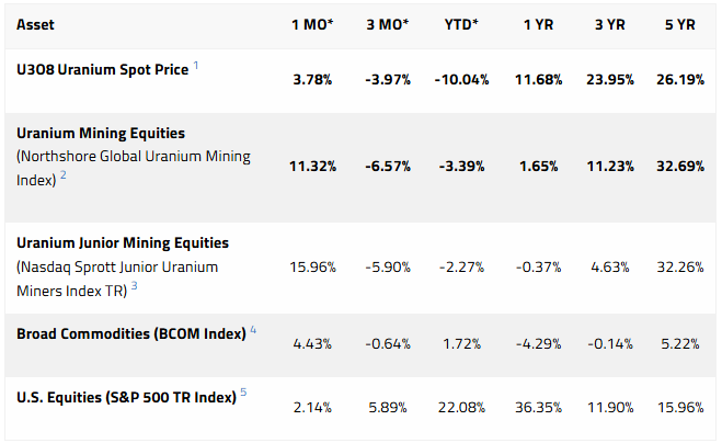 Source: Bloomberg and Sprott Asset Management. Data as of 09/30/2024. Uranium Miners are measured by the Northshore Global Uranium Mining Index (URNMX index); U.S. Equities are measured by the S&P 500 TR Index; the U308 Spot Price is from TradeTech; U.S. Bonds are measured by the Bloomberg Barclays US Aggregate Bond Index (LBUSTRUU); Commodities are measured by the Bloomberg Commodity Index (BCOM); and the U.S. Dollar is measured by DXY Curncy Index. Definitions of the indices are provided in the footnotes. You cannot invest directly in an index. Included for illustrative purposes only.Past performance is no guarantee of future results.