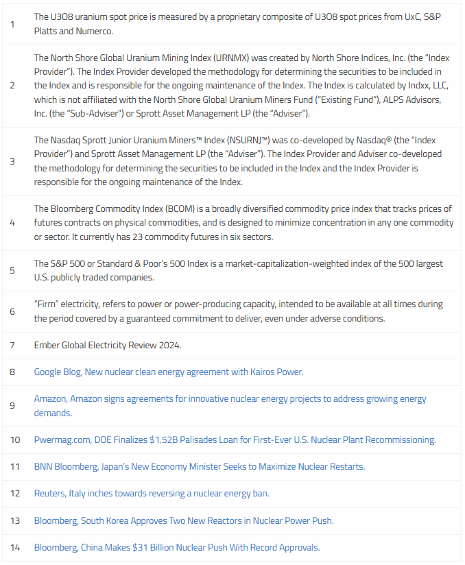 Emerging from the typical summer doldrums, the activity in the uranium market kicked off with the annual World Nuclear Association Symposium. The Symposium brought together participants from all nuclear energy-related sectors: fuel supply, mining, conversion, enrichment, government, research and more. With the theme of "Turning momentum into energy," the industry members discussed how to deliver on last year's pledge to triple nuclear generation by 2050. Though the market remained subdued immediately after the conference, it awakened after Microsoft and Constellation Energy announced a 20-year power purchase agreement to support reopening the Three Mile Island I nuclear power plant, which has been shuttered for five years. Microsoft is searching for clean, "firm" power6 for its electricity-hungry AI (artificial intelligence) data centers. Other large technology companies followed suit with their own nuclear energy announcements, which we believe represent another important inflection point for nuclear energy. First, it provides much-needed capital at a time when government energy policy is trying to "crowd in" private capital to revitalize the dormant nuclear power industry. Second, it raises awareness and helps validate nuclear energy's value across a broad range of investors.