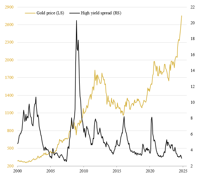 Gold price (USD/oz) and US credit spread (High Yield Spread*) in percentage points