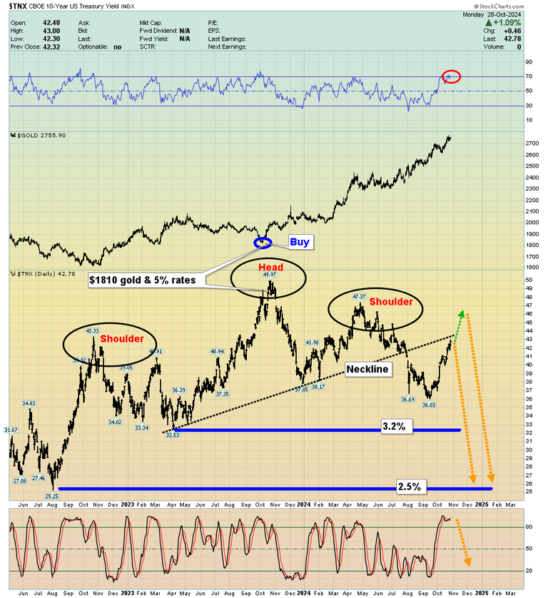 While gold has surged as rates have rallied, a breakdown from this huge H&S top for rates could usher in frenzied Western money manager buying, sending gold straight to $3000-$3300.