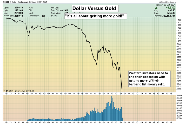 - Sadly, investors in the West have what is perhaps best described as a cave dweller’s primal urge to get more of their government’s barbaric fiat. In contrast, in the rising and massively populated East, the focus is on getting more gold… money that is supreme.