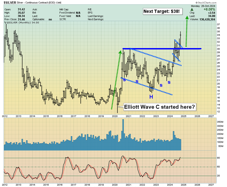 Silver tends to perform best in the late stages of a major rally for gold, and this chart certainly suggests silver is beginning a very significant surge. How high can silver go if gold roars to $3300? The obvious answer is… a lot higher than where it is now!