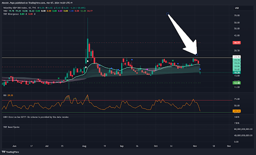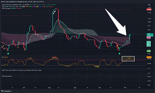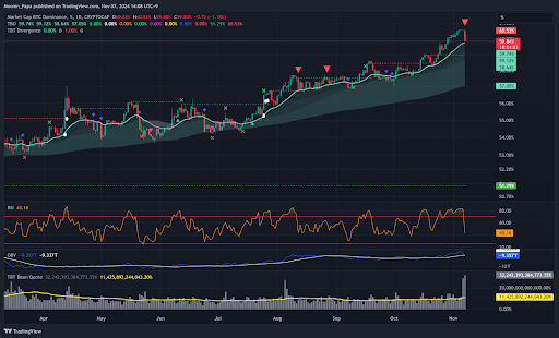 BVOL7D, an indicator tracking Bitcoin’s volatility, surged 19% and moved above the daily TBO Cloud, with overbought RSI suggesting that BTC will continue to experience significant price swings over the next week. This could mean continued pressure on altcoins as Bitcoin takes the spotlight.