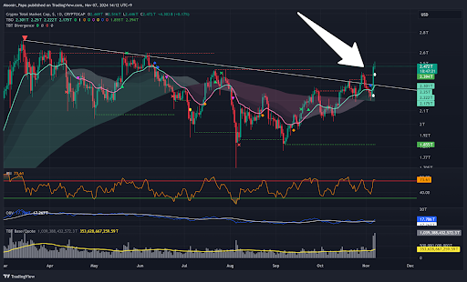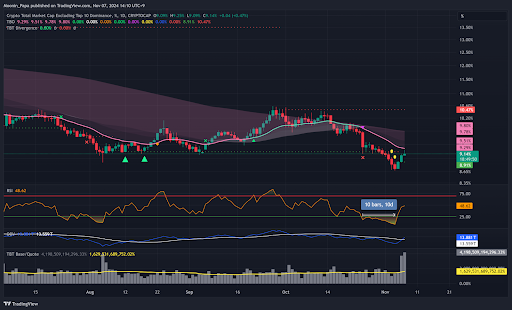 The TOTAL crypto market cap surged by 9% and is in the process of printing another TBO Breakout, backed by strong OBV readings and RSI nearing a close above 70. However, OTHERS market cap remains heavily oversold despite signs of improvement.