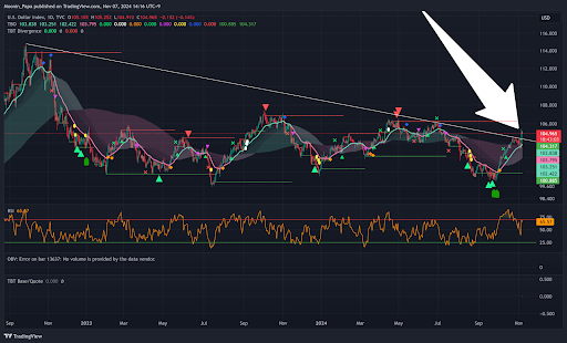 In traditional finance, the DXY broke out above long-term resistance, driven by expectations that Trump’s pro-economy stance will strengthen the U.S. dollar. This development, while surprising, was echoed by all major indices as they posted gains. The S&P 500, Dow Jones Industrial Average, and Nasdaq all achieved new all-time highs, with the Nasdaq even printing a TBO Breakout.