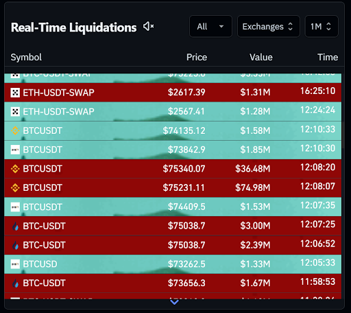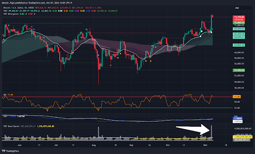The focal point of this explosive move was the surge in trading volume. Bitcoin experienced significant short liquidations totaling $110 million just over the $75,000 mark, with total short liquidations across all exchanges reaching $426 million. This short squeeze propelled BTC to a new all-time high of $76,481 on Bitstamp, supported by a TBO Breakout signal on the daily chart. However, the TBO Slow line remained flat, indicating that consistent bullish momentum will be necessary for the trend to strengthen.