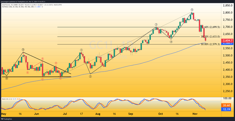 The current market correction has seen gold retreat by more than $200 from its all-time high of $2,802 reached in late October. This pullback represents approximately 46% retracement of the recent rally that began in June when gold futures were established at $2,356. The correction's magnitude aligns with typical market retracements, suggesting a potentially healthy consolidation phase.