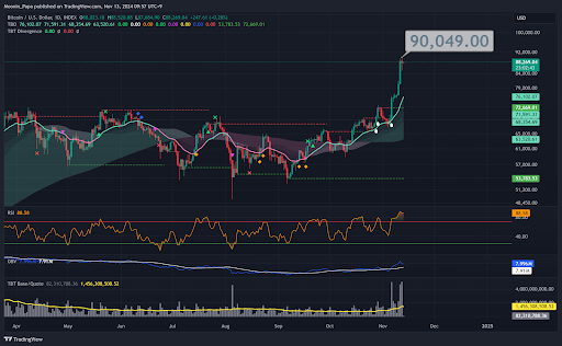 Bitcoin has surged to another new all-time high just north of $90,000. This recent rally is one of the most overextended moves for BTC in years, echoing historic surges during previous bull cycles. While the current price action has been exceptional, let’s take a look at what’s driving this momentum and how it sets the stage for even bigger gains.