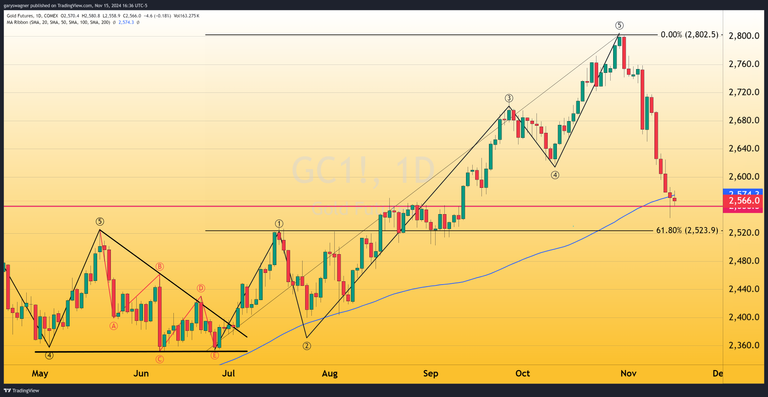Gold futures concluded Friday's trading session with a modest decline of $4.20, settling at $2,566.30 for the December contract, marking its sixth consecutive day of losses. While the precious metal continues its downward trajectory, the intensity of daily declines has notably diminished since Monday's substantial $85 selloff.