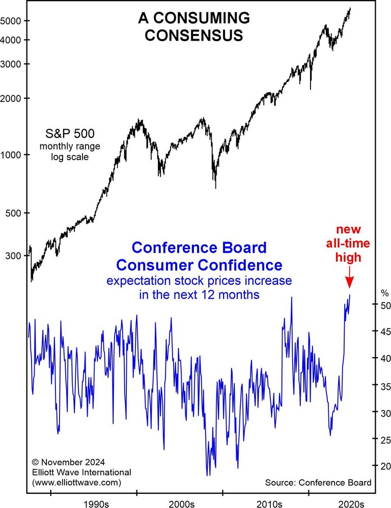 “This chart of the Conference Board Consumer Confidence survey asks consumers whether they expect stock prices to increase over the year ahead. In October, the percentage rose to 51.4%, the highest in the 37 years of Conference Board monthly polling. The general public’s consensus of a rising stock market has more than doubled over the past two years, accelerating higher starting in October 2023. The intensity of the rise suggests a severe case of FOMO (fear of missing out). The run to a new record carried the five-month average to an all-time high of 49.5%, well above the prior five-month extreme of 44.9% in January 2018 (not shown), which led to a net decline over the ensuing 26 months. In the history of the survey, no other reading comes close. The public is euphoric for stocks. Why are so many investors willing to ignore the message of past sentiment extremes? They are herding non-rationally to express a historically positive financial mood. Invariably, they commit to it in the greatest number at the worst possible moment.”