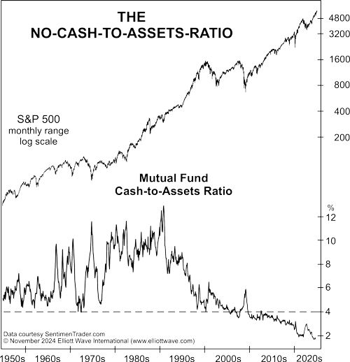 The following chart and narrative from a recent The EW Theorist highlight the low levels of cash being held by mutual funds: