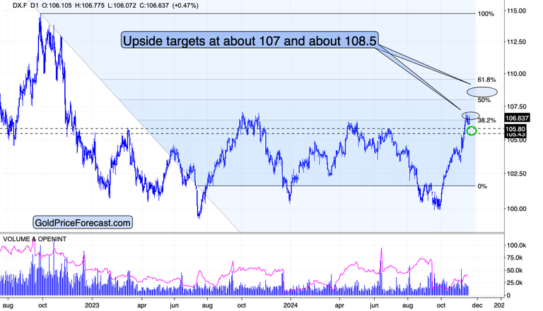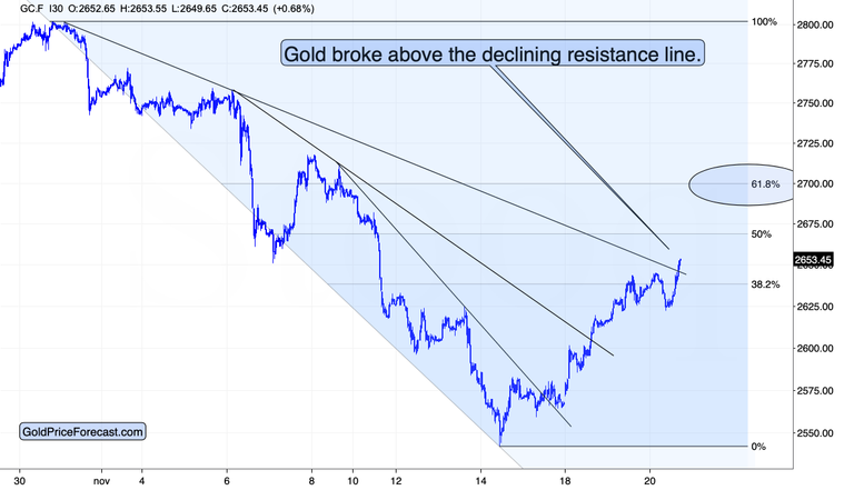 Based on today’s breakout above the declining, short-term resistance line and the above-mentioned gold-USD link, it seems that gold can really move all the way up to $2,700 (which is also its 61.8% Fibonacci retracement for this correction) before the top is in.