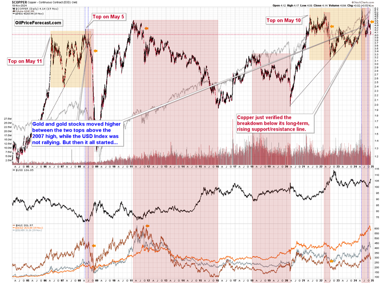 Why am I writing about copper here? One is because FCX and copper itself offer great shorting opportunities in my view, but the other is that copper and precious metals tend to be aligned during the really big moves and given that copper is on the verge of invalidating the move above its 2006 high, it seems that the decline that is going to follow will not be minor.