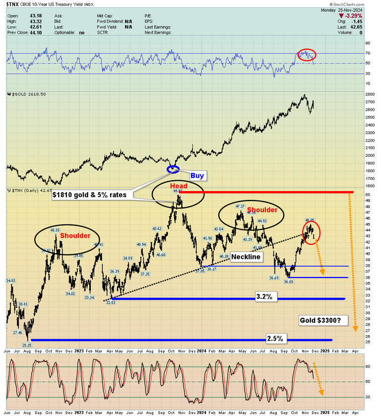 Depending on what inflation is doing, falling US rates can be either a tailwind or a headwind for gold. Currently, inflation has been fading and rates look set to fall away from the neckline of a loose but large H&S top pattern.