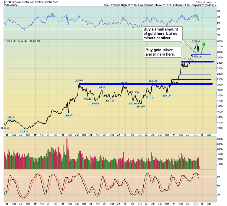 On the long-term weekly chart for gold, there is no significant volatility or price action of concern, but gold is not in a significant buy zone either, let alone one for silver and the miners.