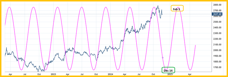 Double-click to enlarge this four month gold cycle chart. The next low in the cycle comes around Dec 14 and the next high comes near the Chinese New Year peak at about Feb 5, 2025.