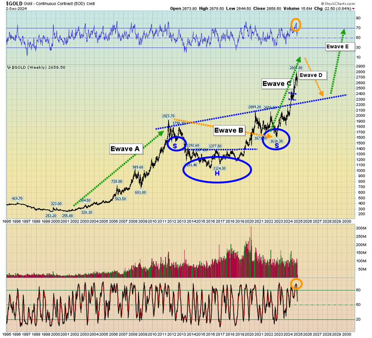 - That pullback would also put gold at the neckline of the huge inverse H&S pattern that launched Wave C… and a glorious E wave would be launched from there!