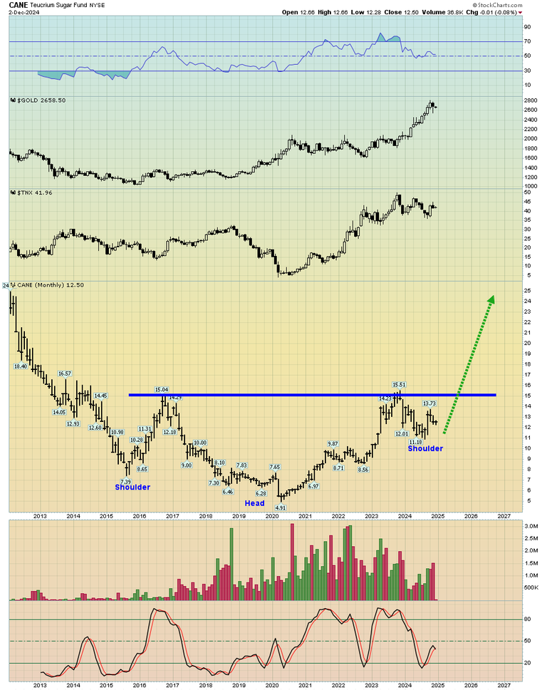 Double-click what could become to be viewed as “chart of the decade” in the years ahead. Sugar is a key indicator of Mainstreet inflation, and basis this CANE ETF, a massive inverse H&S base pattern is in play. I’m a buyer, and with some decent size.