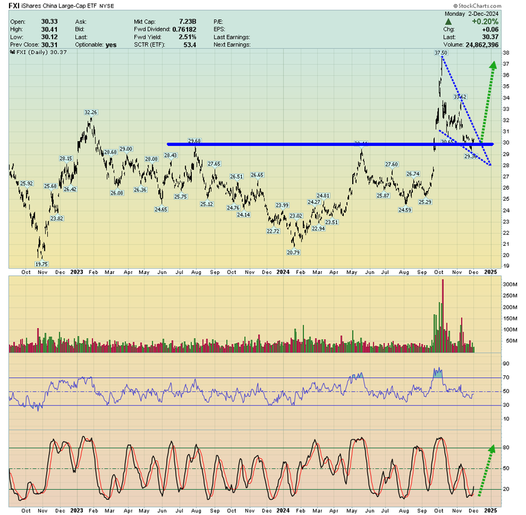 - The good news is that the Chinese stock market (basis the FXI ETF) has pulled back to the base pattern breakout zone and looks set to surge. Why would this happen with the economy there in such rough shape?