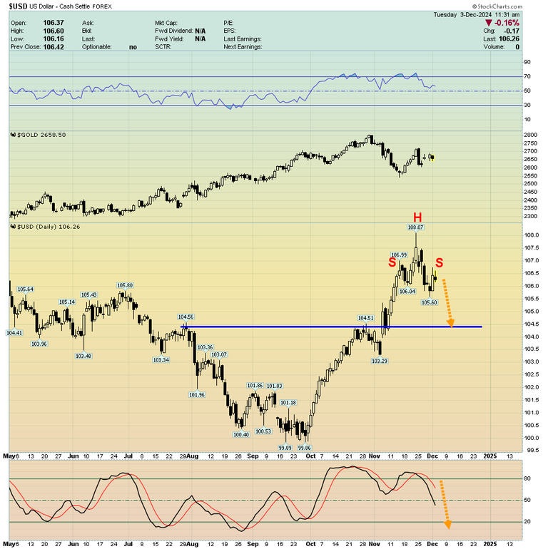 A potential tail wind is the US dollar, and for an ominous look at it. There’s finally some H&S top action in play on the daily chart.