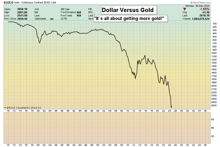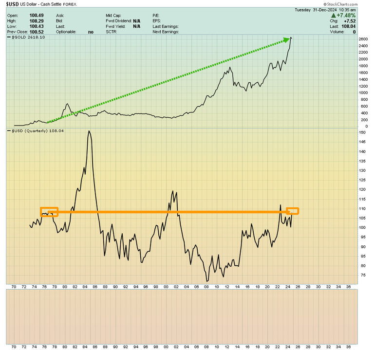 What about the purported key relationship of the dollar index (USDX/DXY) and gold? In 1976, the dollar index was at about 108, and it’s about 108 now. In 1976, gold was about $100, and it’s $2600 now!