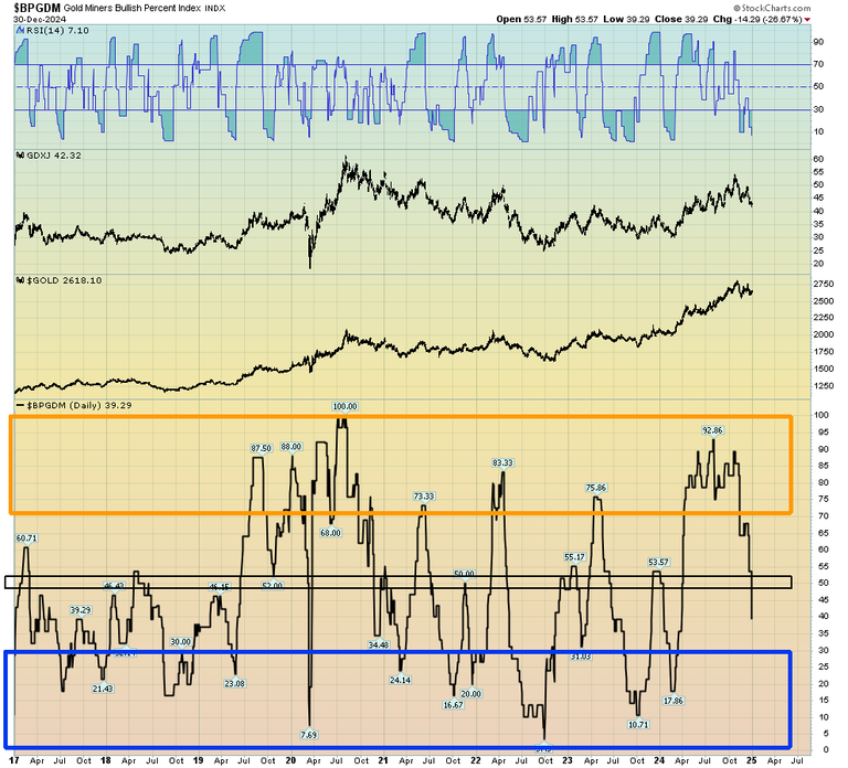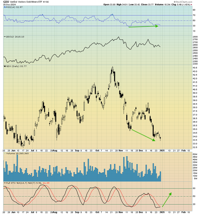 For a third look at GDX. The RSI oscillator is not confirming the drop in price below the November low. That’s a positive sign.
