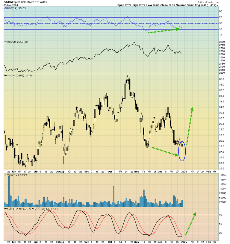 The SGDM ETF is an alternative to GDX, and it’s sporting a huge reversal candlestick on this daily chart. Stochastics is also looking good and the same bullish non-confirmation of RSI with the price is in play.
