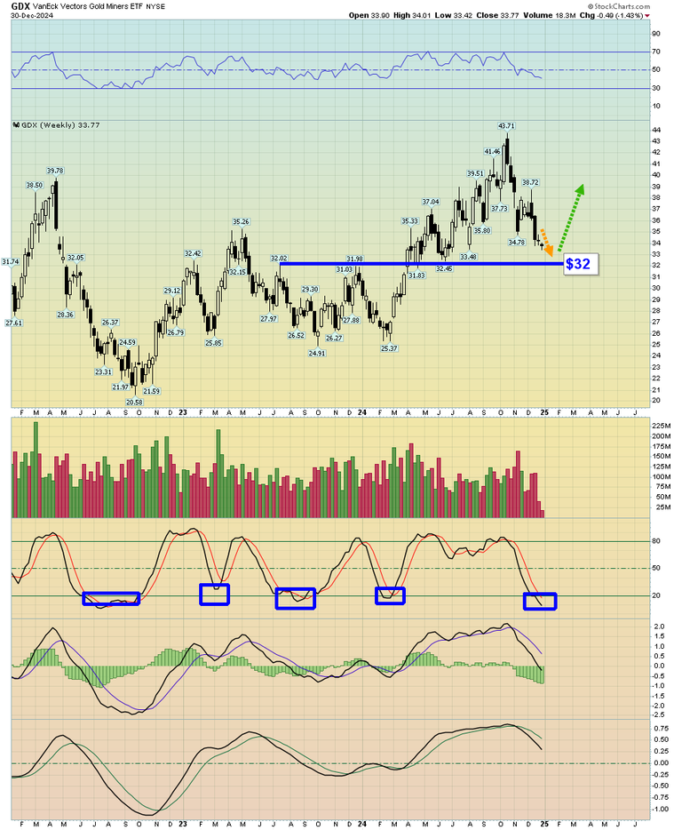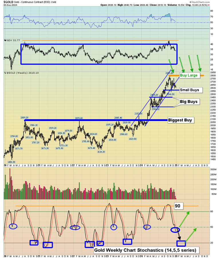 - The oscillator could turn up here, but if it becomes oversold as the price arrives at support of size like $2550, gold, gold stocks, and silver bullion will be solid buys.