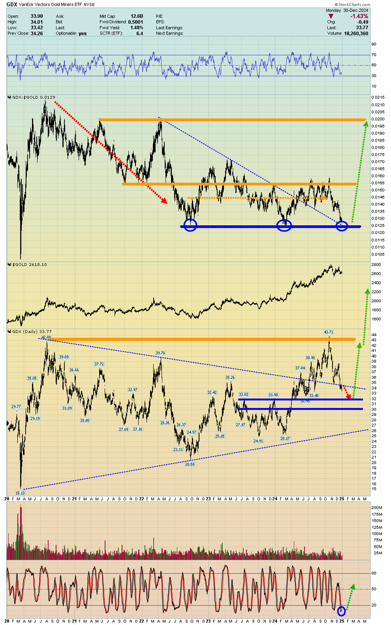 - Also, note the GDX vs gold action at the top of the chart. GDX is very close to major support against gold!