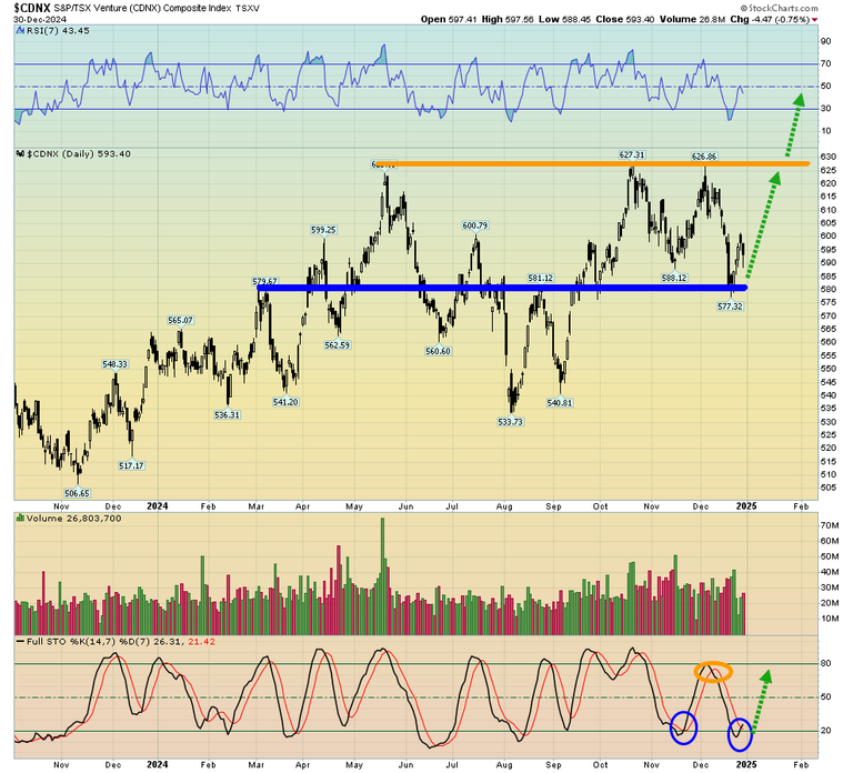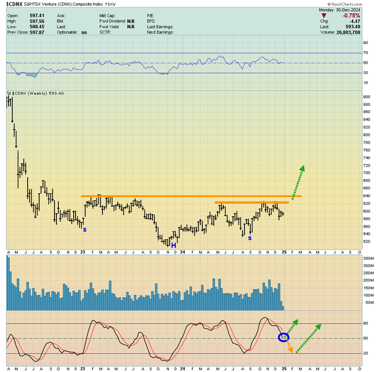 The CDNX weekly chart shows a loose inverse H&S base pattern and a breakout above 620-640 could create a powerful rally.