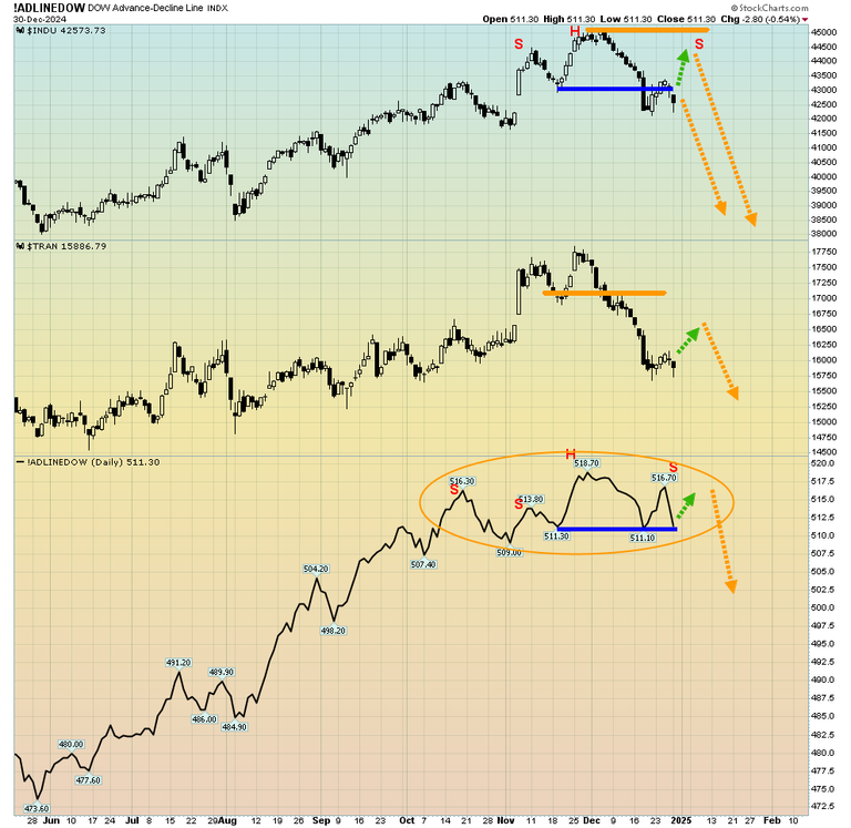 The stock market advance/decline line looks shaky, as do the Dow Transports. The Industrials also look toppy.