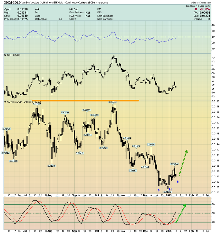 For a solid look at the ratio chart of GDX versus gold. There’s loose inverse H&S pattern action. All technical lights on the above charts are green!