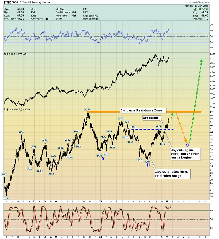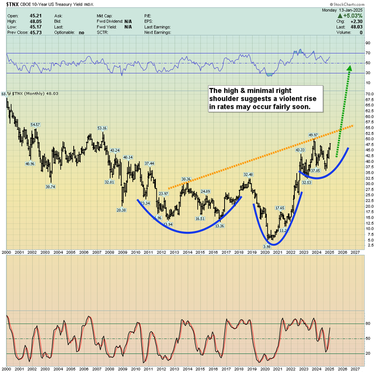- Having said that, investors can expect a substantial dip in rates from the strong resistance formed by the previous highs at 5%... before rates shock the world and begin a long-term rise that is unlikely to peak until the year 2060.