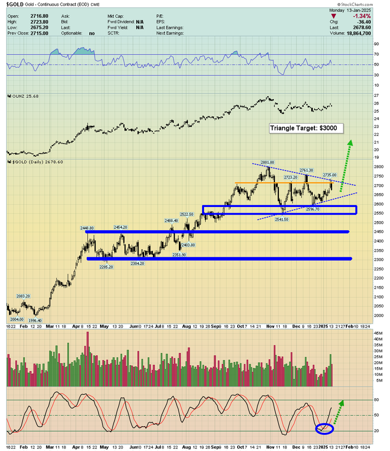 The only question is whether the daily chart triangle breakout occurs with gold near the demand line of the triangle and weekly chart Stochastics fully oversold…