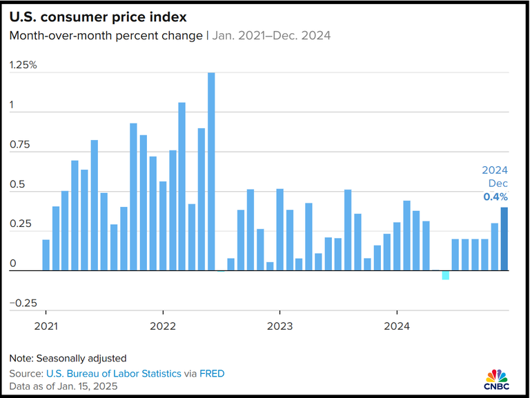 The U.S. Bureau of Labor Statistics reported that inflation rose 0.4% in December, exceeding both November's 0.3% increase and analysts' consensus estimate of 0.3%. The annual inflation rate stood at 2.9% before seasonal adjustments. Core CPI, which excludes volatile food and energy prices, showed a 3.2% annual increase, slightly below the expected 3.3%.