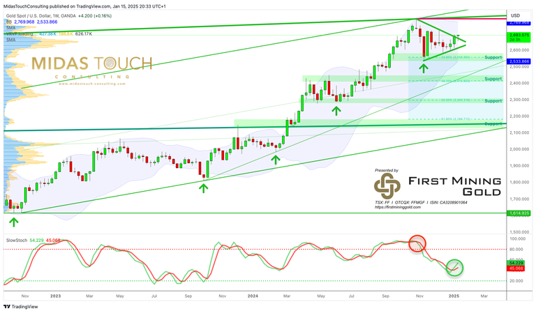 Gold’s recent performance and technical analysis paint a cautiously optimistic picture for the precious metal in early 2025. The metal has shown remarkable resilience, rebounding from its December 2024 lows to challenge key resistance levels. The triangle formation, coupled with a new buy signal from the weekly stochastic oscillator, suggests a potential continuation of the upward movement. This technical setup, combined with seasonal support, indicates that gold may be poised for a breakout to the upside, potentially targeting its all-time high of USD 2,790 in the coming months.