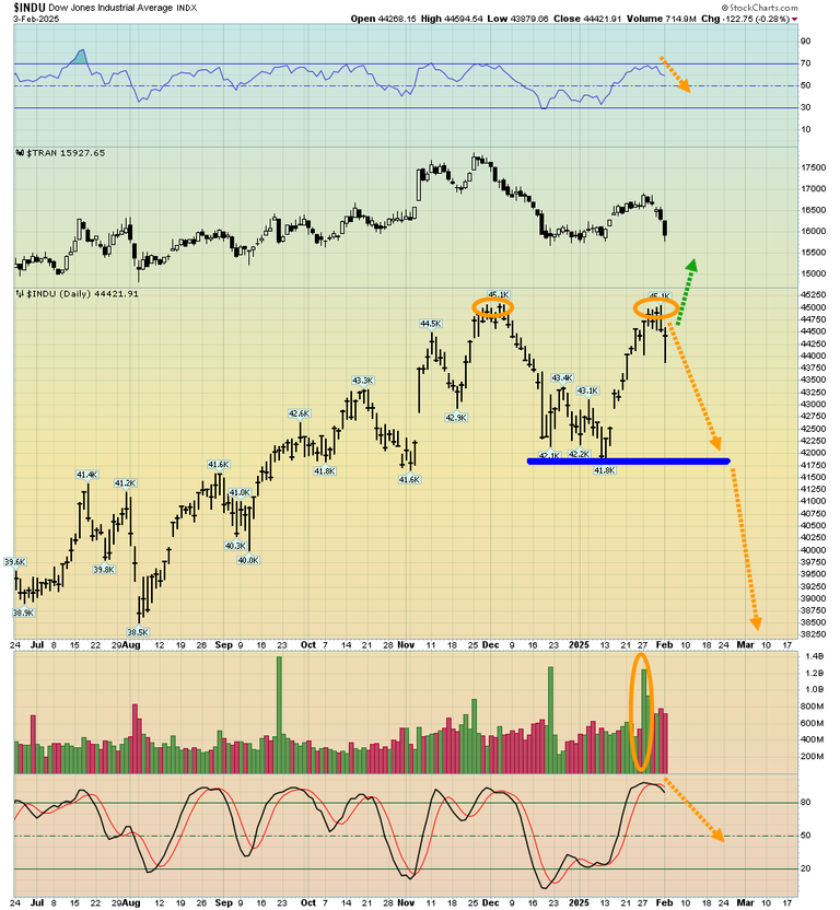 Well, for the answer to this key question. Double-click to enlarge this vital US stock market chart. A major double top, an end to the bull market, and the potential 1929 or 1966 wipeout were all pretty much a “done deal”… before Trump killed the tariffs and the Panama invasion.