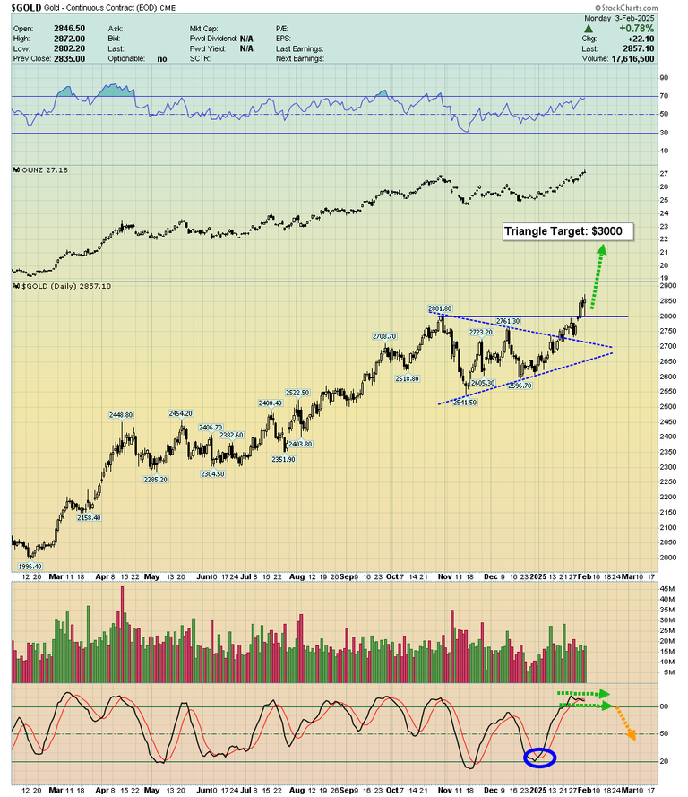 Double-click to enlarge this stunning weekly chart. The lead Stochastics (14,5,5 series) line is now overbought but the target of the beautiful symmetrical triangle is $3000+. Stochastics likely stays overbought while the price moves nicely higher.