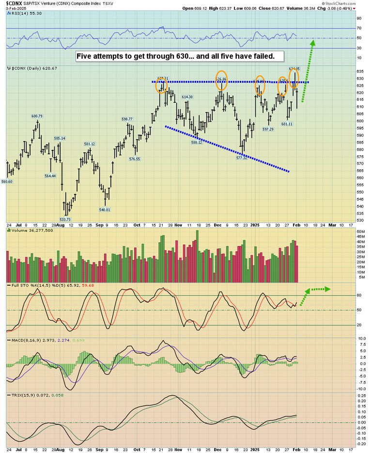 Double-click to enlarge this CDNX daily chart. Will the sixth time be a charm? I think so, and the huge reversal bar yesterday and the momentum zone buy signal for 14,7,7 series Stochastics suggests it could happen by the end of this week.