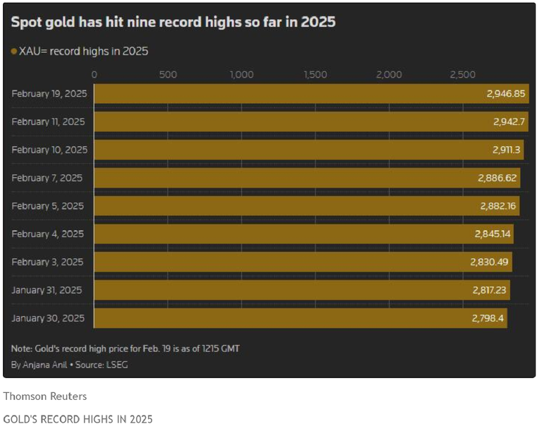 Gold continues its remarkable ascent in 2025, achieving nine record highs year-to-date despite recent price fluctuations. The precious metal has demonstrated exceptional performance, with futures contracts gaining about 11% since January and nearly 4% in February alone.
