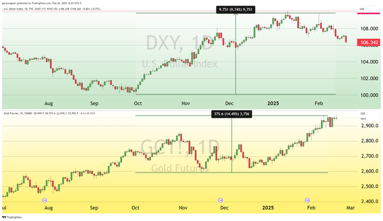 Gold continues to demonstrate remarkable strength in early 2025, trading near record levels while the U.S. dollar faces mounting pressure. The precious metal reached an unprecedented closing price of $2,957 per ounce on Thursday, February 13, marking a significant surge from its December position of $2,600.