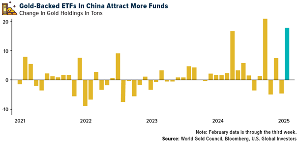 - Gold-backed ETFs in China swelled with 17.7 tons of inflows in the first three weeks of February, nearing a record 20.9 tons, driven by a pilot program allowing insurers to buy gold for the first time, as reported by Bloomberg this week. With banks like Goldman Sachs forecasting prices to $3,100-$3,300 per ounce by year-end, this surge reflects gold’s rising role as a hedge against currency depreciation and a diversification tool.